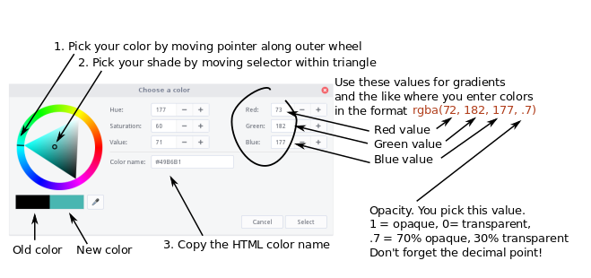 The color picker your browser displays may differ from this one, but, hopefully, this diagram will help you figure out how to work it.